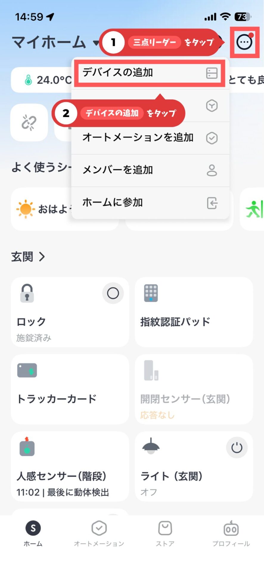 Switch Botアプリを開き、右上の「①三点リーダー」をタップし、「②デバイスの追加」をタップします。