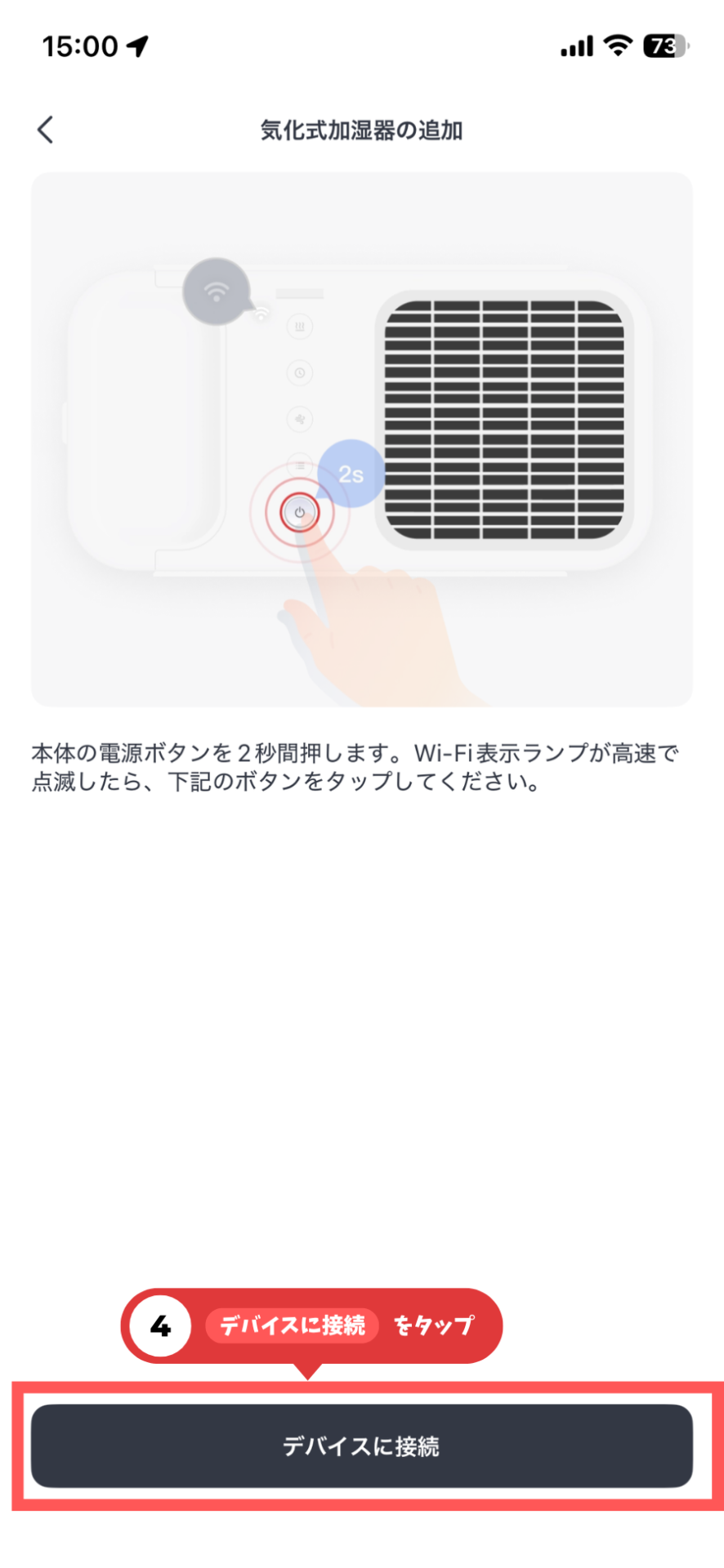 気化式加湿器本体の電源ボタンを2秒以上長押しした後に「④デバイスに接続」をタップします。