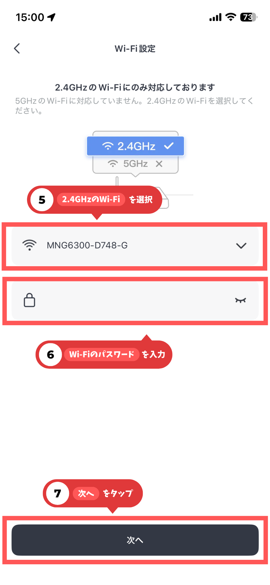 「⑤2.4GHzのWi-Fi」を選択し、「⑥Wi-Fiのパスワード」を入力します。