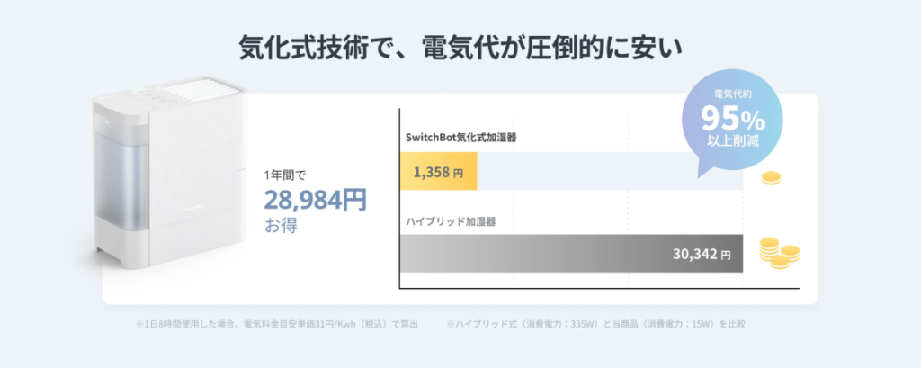 SwitchBot 気化式加湿器を使って驚いたのは、電気代の安さです。