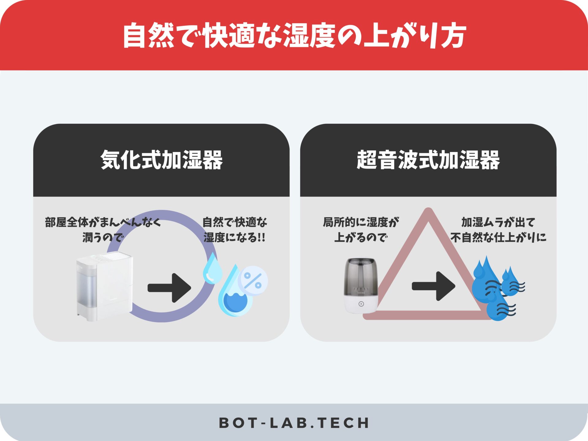 気化式は省エネで結露しにくく、白い粉も出ません。超音波式は素早く加湿できますが、床が濡れやすい特徴があります。