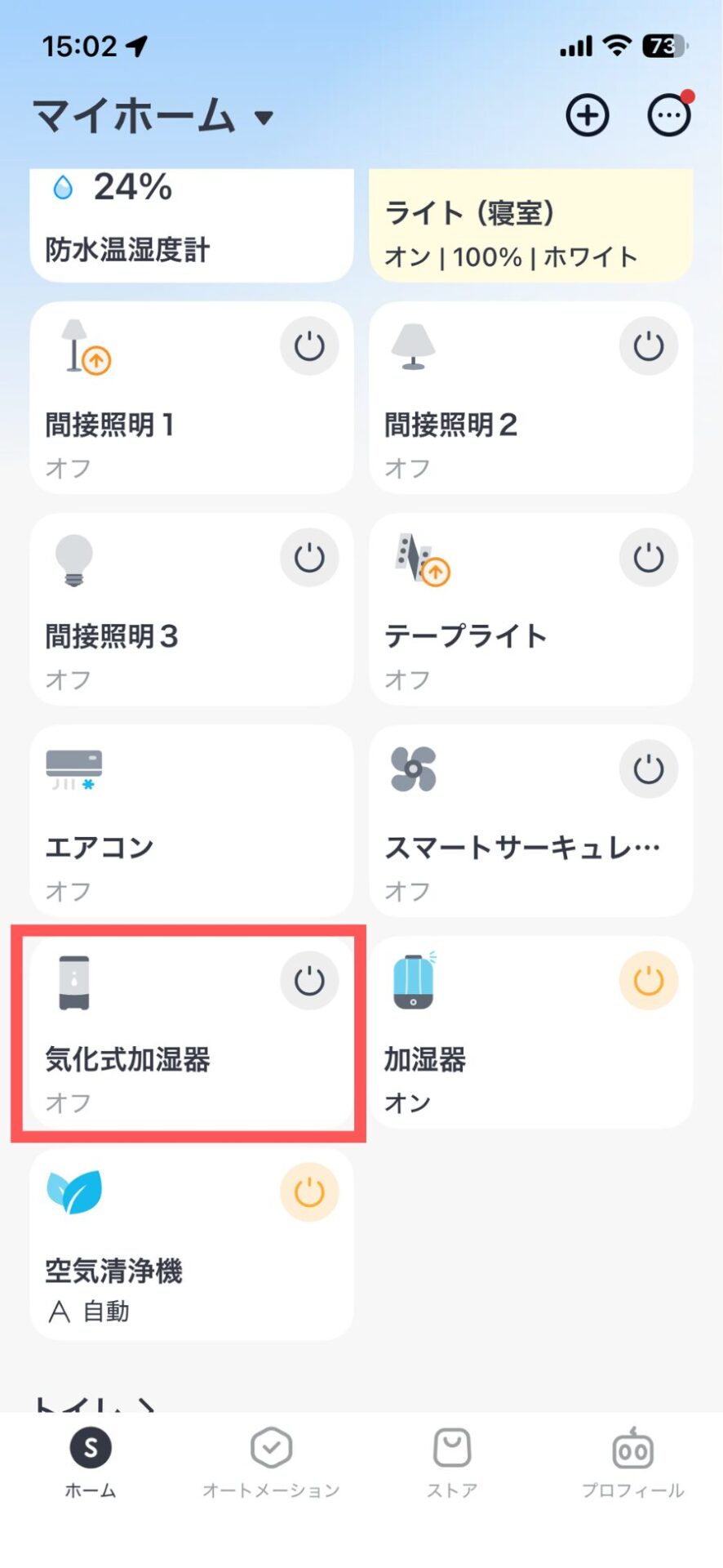 アプリのホームに気化式加湿器が追加されていれば完了です。