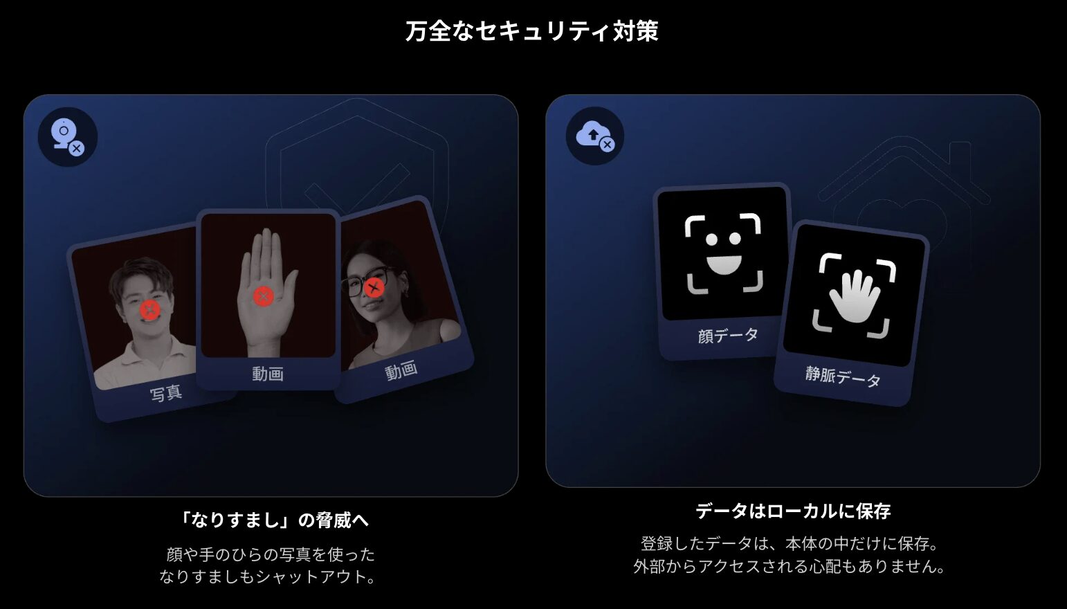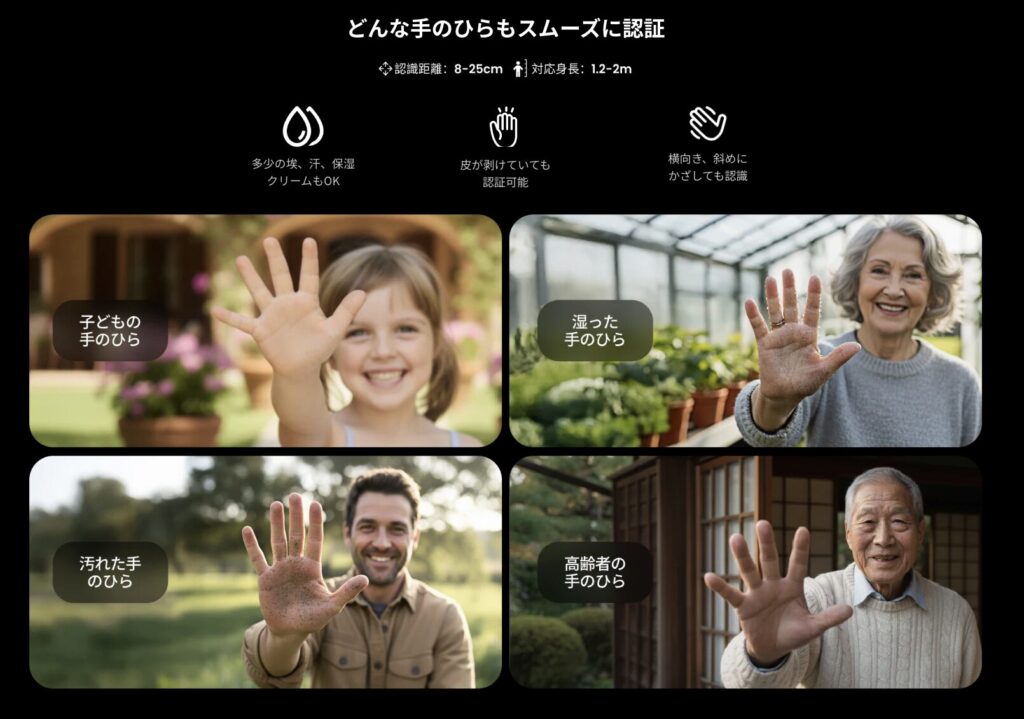顔を向けるだけで解錠できる。暗所でも安定する。さらに、手のひら静脈というもう一つの生体認証も使えます。