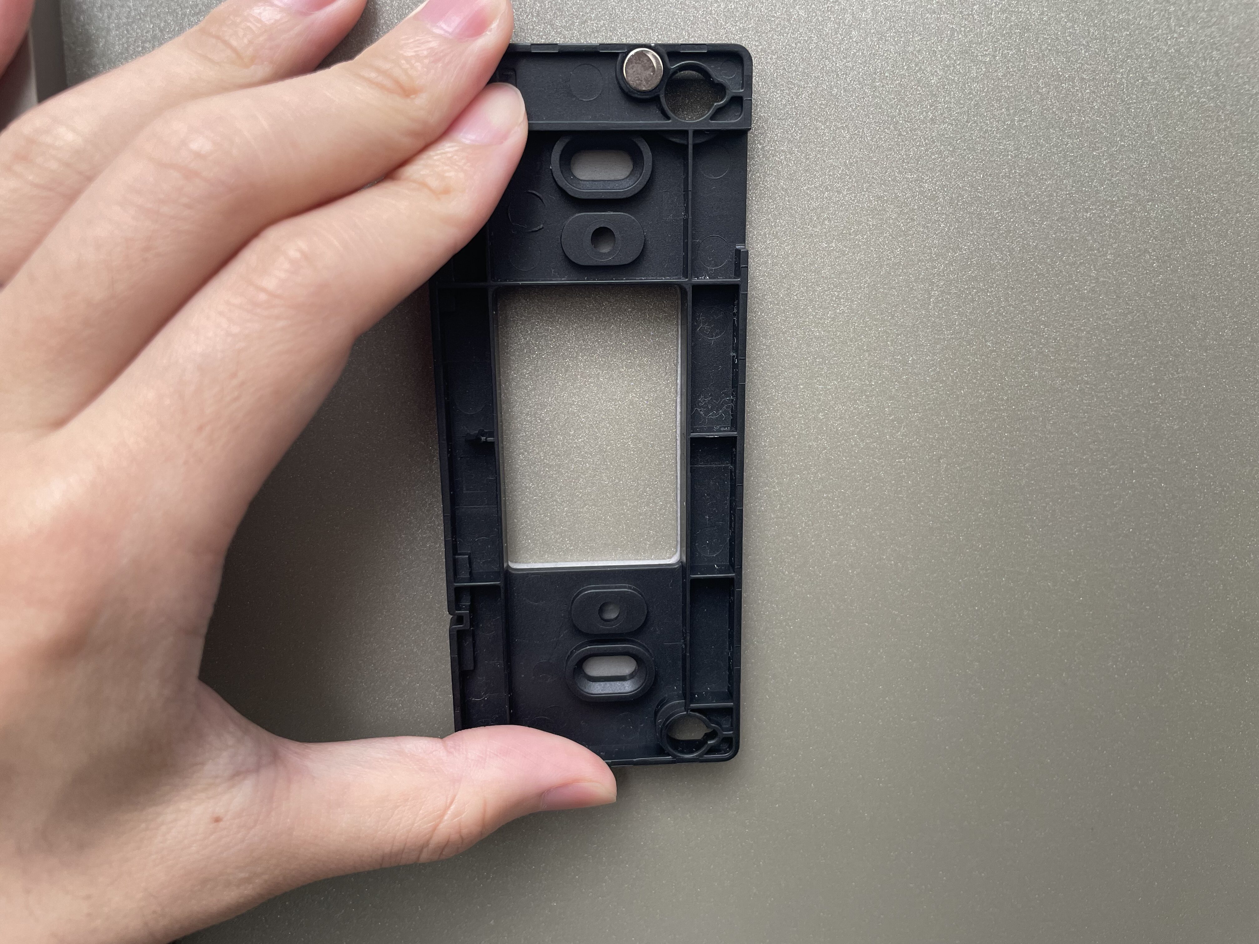 本体を壁やドア枠に固定するための土台パーツです。設置面の形状や、両面テープ固定かネジ固定かで使い分けます。プレートを先に固定し、そこに本体を取り付けるイメージです。