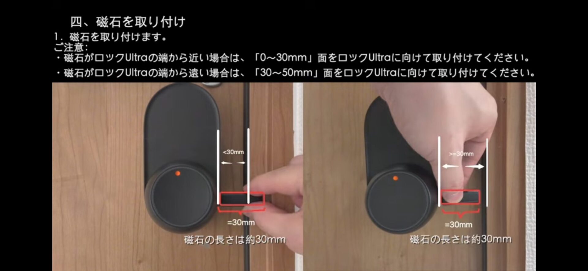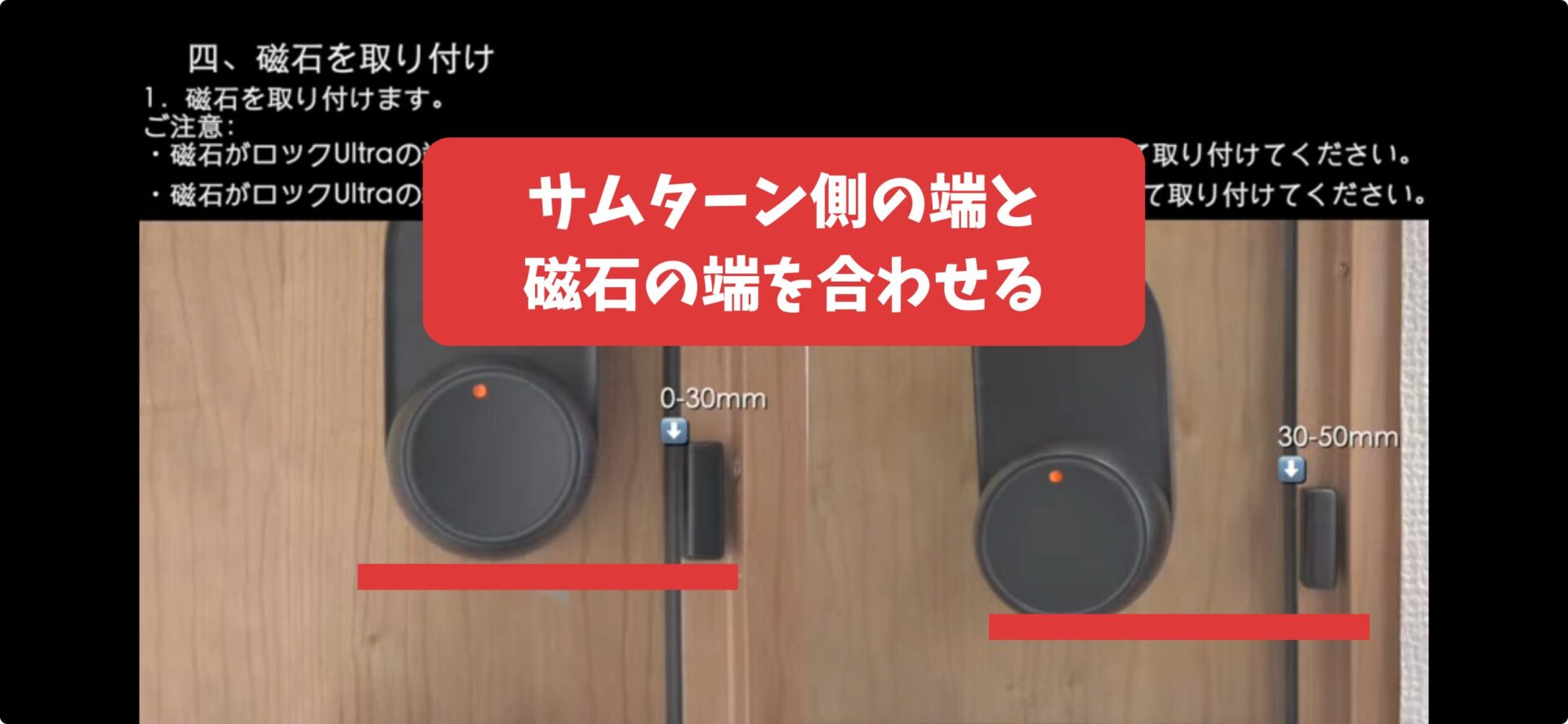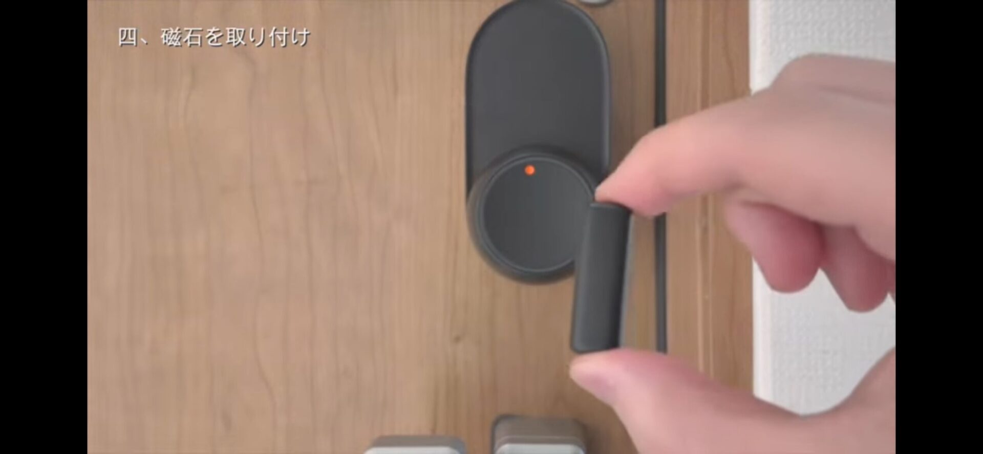 サムターン側の端と磁石の端を合わせるように取り付けてください。