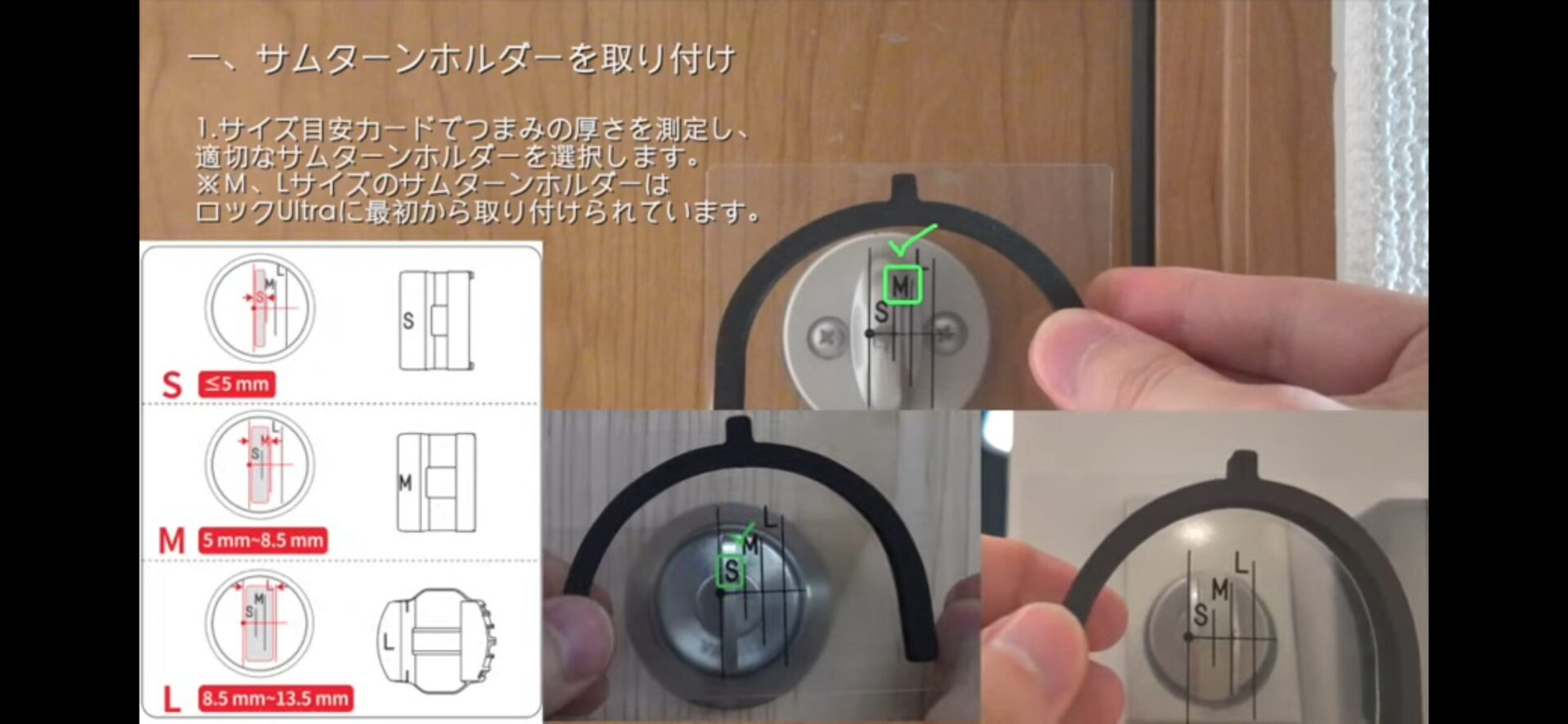 サイズ目安カードで、ご自宅のつまみの厚みを測定し、適切なサムターンホルダーを選択します。